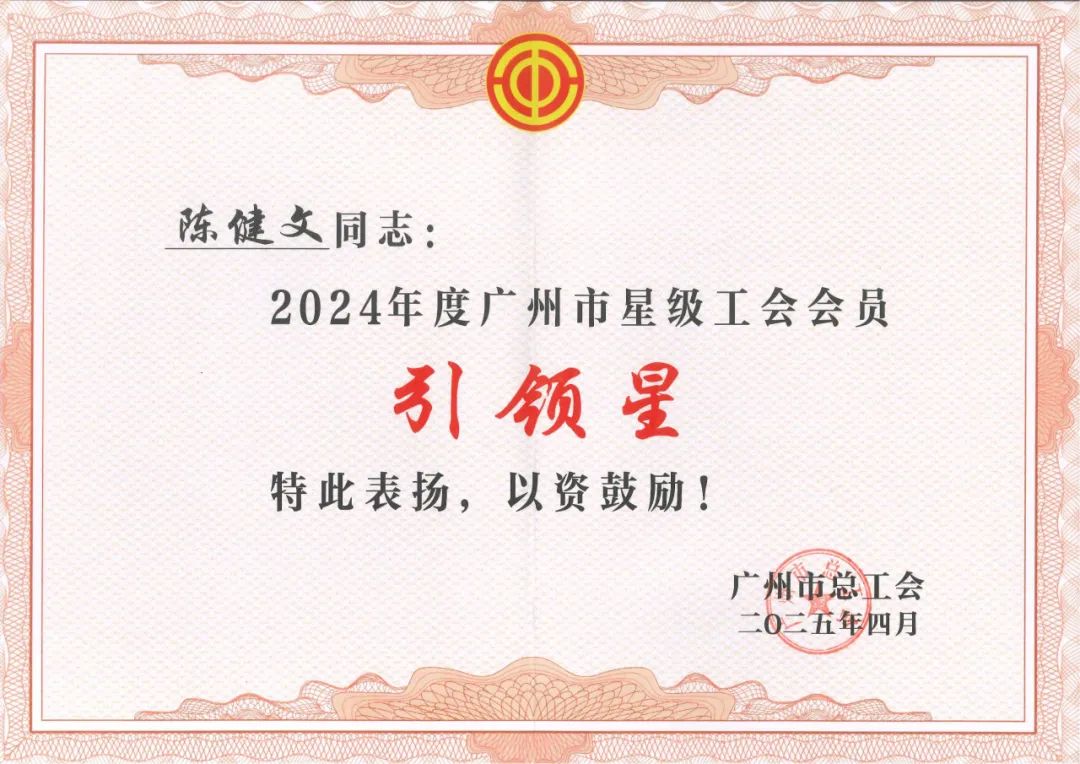 集团党支部书记兼工会副主席陈健文同志荣获2024年度广州市 “引领星” 星级工会会员声誉证书。